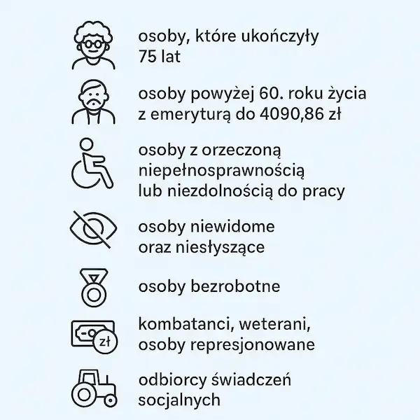 | Seniorzy 75+ | Zwolnienie automatyczne, bez formalności |